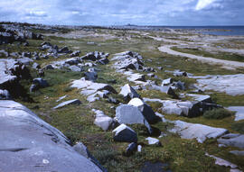 Shoreline of west coast of Hudson Bay at Churchill. Granite boulders with scrubby, stunted, very old Spruce trees.